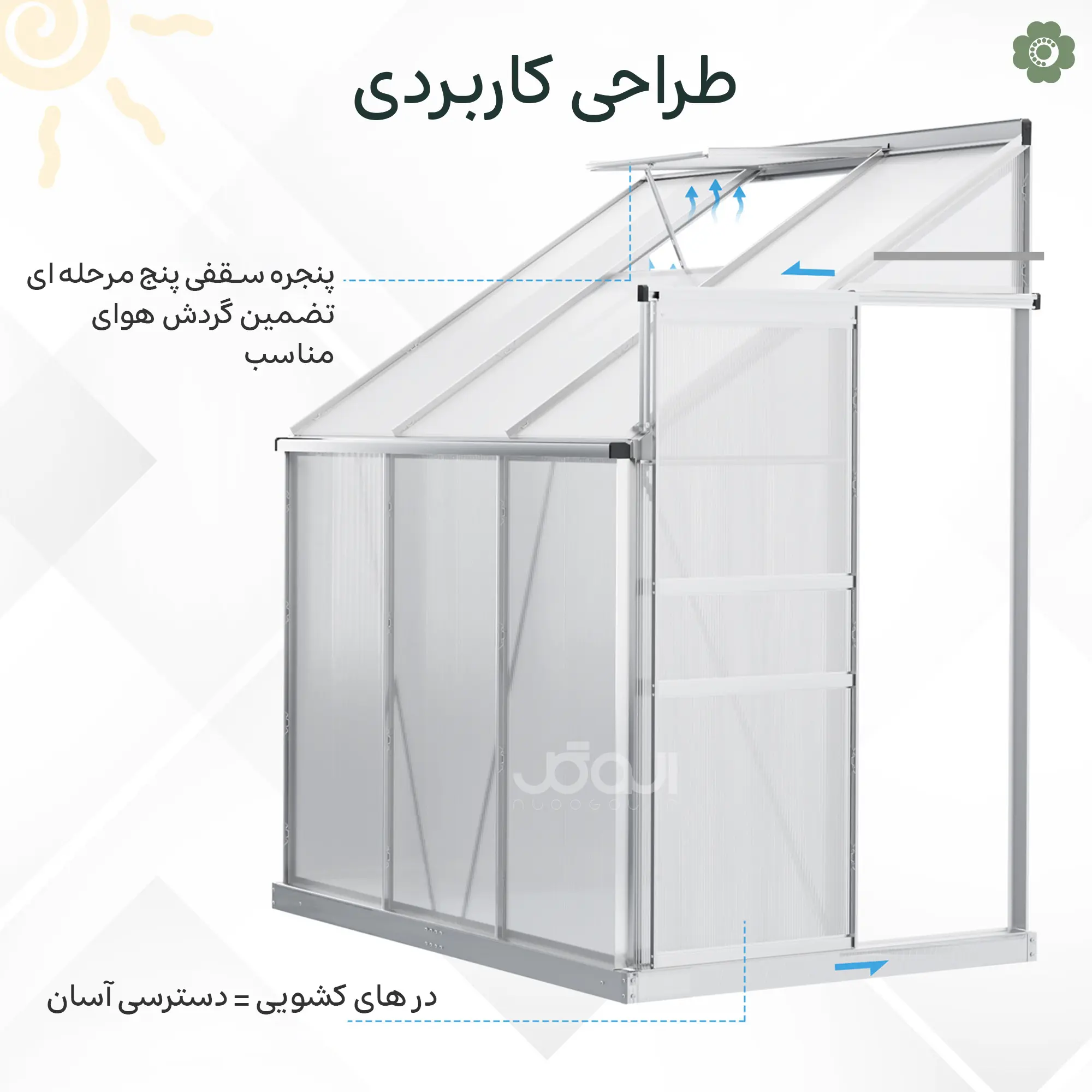 پنجره دستی تعبیه شده در سقف به شما این امکان را میدهد که بر روی دما و رطوبت فضای داخل گلخانه در روز های گرم تابستان کنترل داشته باشید.